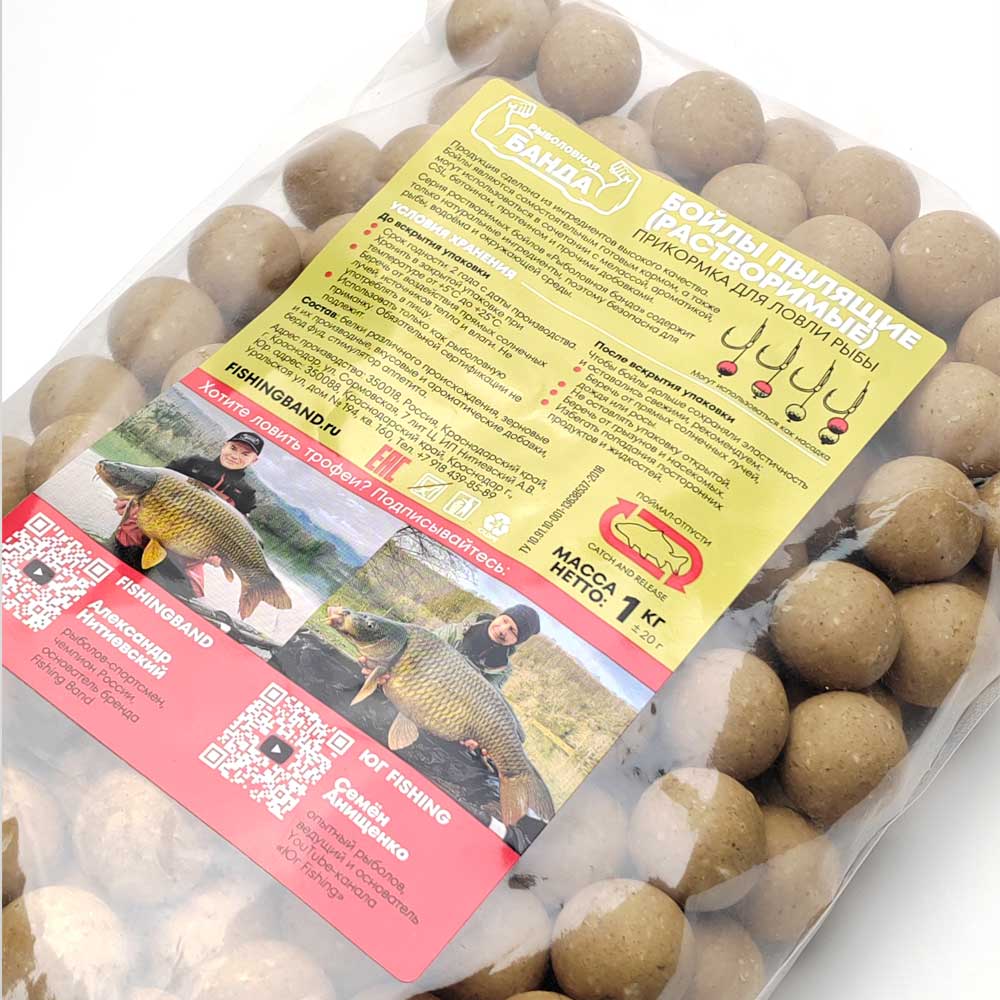 Бойлы растворимые (пылящие) «Рыболовная банда» – совместная серия Александра Нитиевского и Семёна Анищенко. Рецептуры проверены на сотнях рыбалок и показали высокую эффективность на диких и платных водоёмах. Пылящие бойлы быстро выделяют ароматические вещества, полностью растворяясь, при этом не перенасыщая рыбу. Имеют в составе патоки, поэтому отличаются сладким вкусом, который привлекателен для активного карпа и амура. Бойлы безопасны для рыбы, водоёма и окружающей среды.
