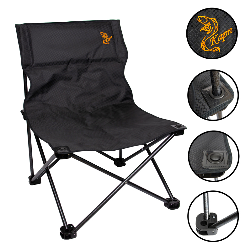 Каркас изготовлен из металлической трубы, покрыт молотковой краской (устойчива к царапинам и сколам), соединен винтами и денферными гайками. В основаниях кресла используется прочная пластмассаа. Обивка изготовлена из ткани Оксфорд 600 ПВХ (не промокает, легко чистится от загрязнений), усилен тканью из пленочных нитей (не растягивается). В подголовнике мягкое наполнение. В местах прохождения трубы через ткань установлены пластиковые прокладки, усиленные люверсами из цветного металла (не позволяет рваться ткани). Размеры: глубина-410 мм., ширина-420 мм., высота спинки-420 мм., высота сидения-450 мм., вес-3,4 кг. Нагрузка-120 кг.
