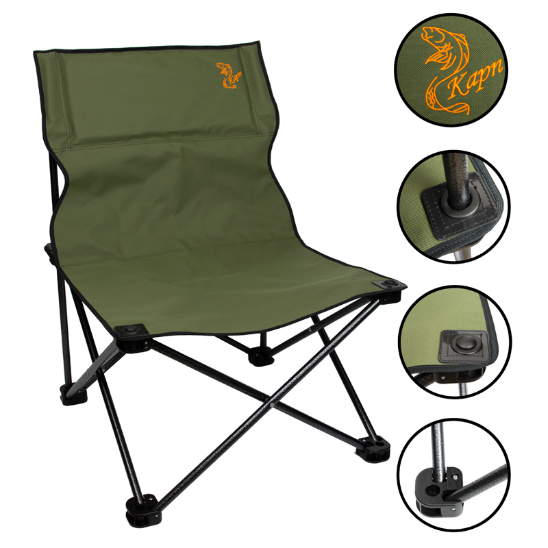 Каркас изготовлен из металлической трубы, покрыт молотковой краской (устойчива к царапинам и сколам), соединен винтами и денферными гайками. В основаниях кресла используется прочная пластмассаа. Обивка изготовлена из ткани Оксфорд 600 ПВХ (не промокает, легко чистится от загрязнений), усилен тканью из пленочных нитей (не растягивается). В подголовнике мягкое наполнение. В местах прохождения трубы через ткань установлены пластиковые прокладки, усиленные люверсами из цветного металла (не позволяет рваться ткани). Размеры: глубина-410 мм., ширина-420 мм., высота спинки-420 мм., высота сидения-450 мм., вес-3,4 кг. Нагрузка-120 кг.
