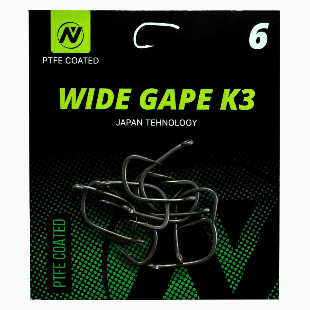 Карповый крючок Wide Gape К3 – разработан и изготовлен совместно с японской компанией. Выполнен из прочной, высокоуглеродистой проволоки и покрыт специальным тефлоновым покрытием PTFE, обеспечивающим долговечность и лучшую засечку. Крючок с широким зевом, имеет повернутое внутрь ушко и прямое острое жало с микробородкой. Применяется во многих оснастках, в том числе с флюорокарбоновыми материалами.