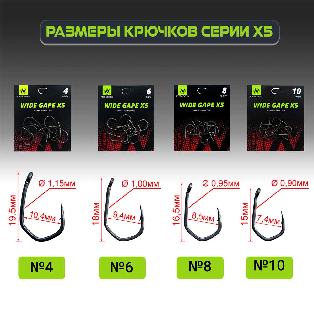 Карповый крючок Wide Gape X5 – разработан и изготовлен совместно с японскими инженерами. Выполнены из высокоуглеродистой стали, со специальным тефлоновым покрытием PTFE. Угловой дизайн, придает дополнительную прочность на разгибание и надежно удерживается при засечке. Крючок имеет широкий зев с загнутым ушком и острым, коническим жалом с микробородкой. Универсальная серия, применяется во многих видах оснасток, в том числе и Зиг Риг.