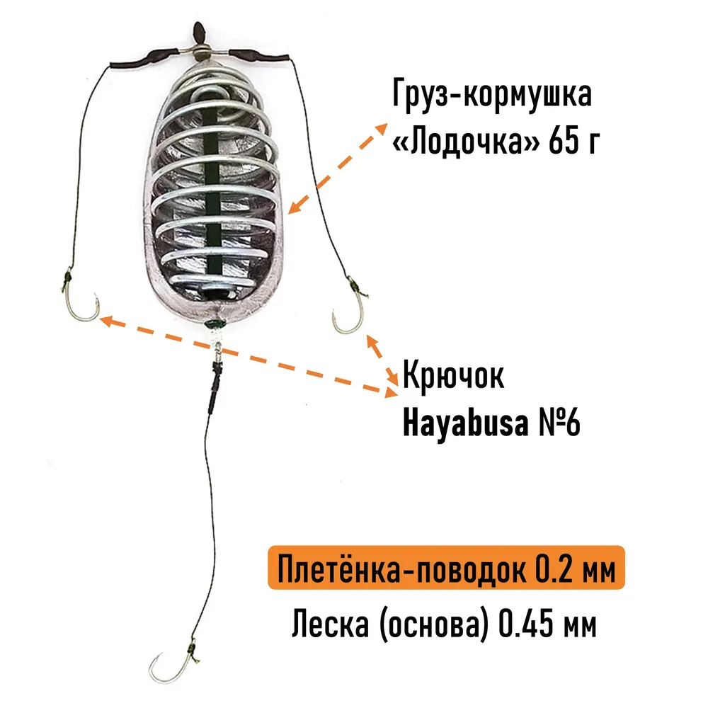 Оснастка предназначена для ловли карповых и других видов рыб на умеренном и сильном течении. Она оснащена двумя крючками и груз-кормушкой лодочкой весом 65, 90 и 120 граммов.