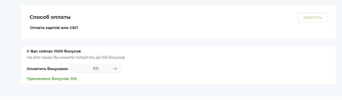 При оформлении заказа под полем Способ оплаты появится возможность списание бонусов, если у вас они имеются. Там в поле вы можете указать то количество бонусов, которое хотите списать. Бонусами возможно списать не более 30% стоимости товаров. Стоимость доставки бонусами оплатить нельзя.
